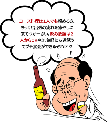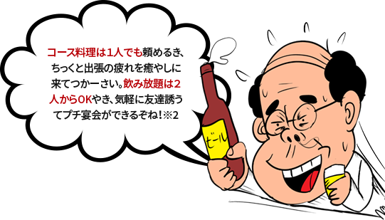※2【土佐弁】コース料理は1人でも頼めるき、ちっくと出張の疲れを癒やしに来てつかーさい。飲み放題は2人からOKやき、気軽に友達誘うてプチ宴会ができるぞね!