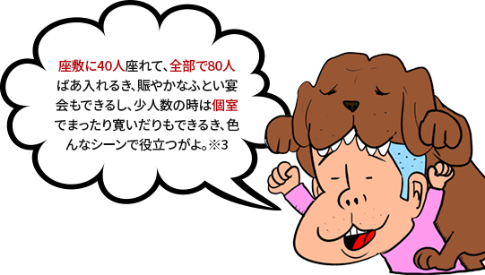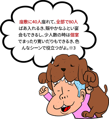 ※3【土佐弁】座敷に40人座れて、全部で80人ばあ入れるき、賑やかなふとい宴会もできるし、少人数の時は個室でまったり寛いだりもできるき、色んなシーンで役立つがよ。